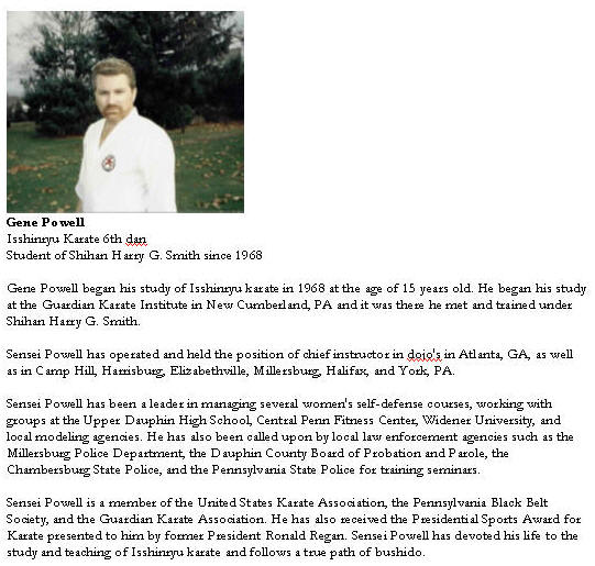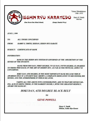 I have listed those who I know personally, have the greatest respect for, and know them to be honorable persons. Each Sensei will have their own family tree in their particular page. If you feel you belong in a certain page, give proper documentation, I will add your history to your sensei's page. If you know a particular Sensei to warrant their own heading feel free to submit that information. This information should follow the sample as below.