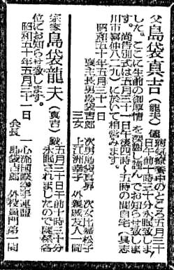 Father SHIMABUKURO SHINKICHI (Tatsuo) We would like to thank all of you for your friendship while he was alive. The viewing shall be held at our home (Gushikawa City, Kinaka 829) from 4:00-5:00 PM on 31 May 1975.