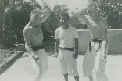 My first introduction to him was through Don Nagle. I saw Don Nagle working out in a crossit at Ten Gen. Ten Gen was Camp Courtney on Okinawa. This is in 1956. Don Nagle was my first introduction to karate. At first it was comical watching him go through his katas, but then it was also fascinating so I asked and he explained, I watched, again I asked and he explained. I Went to the dojo as his guest. The Dojo was in Kyan. Kyan was a little village about a quarter of a mile at the other side of Terigawa and about a half mile into the boondox, the rice patties.